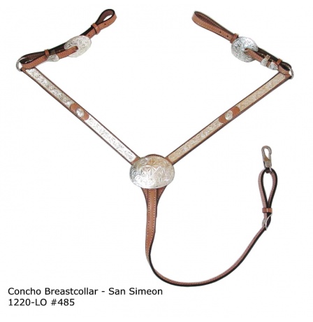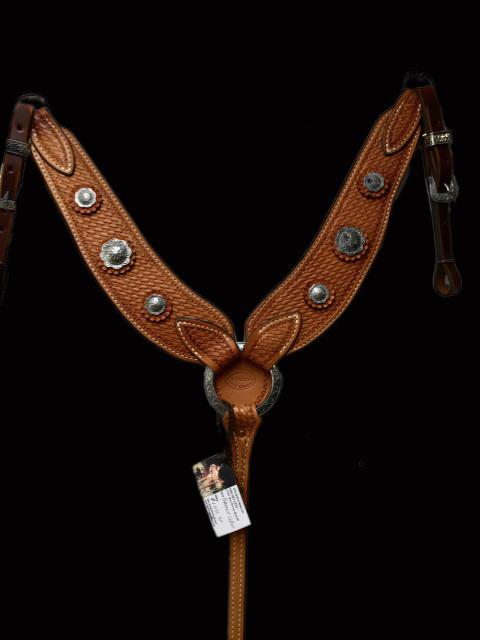 Concho Breast Collar shown in light oil with 310S/S silver. Also dark oil, chestnut, chocolate, and black leather. Please allow 4-6 weeks