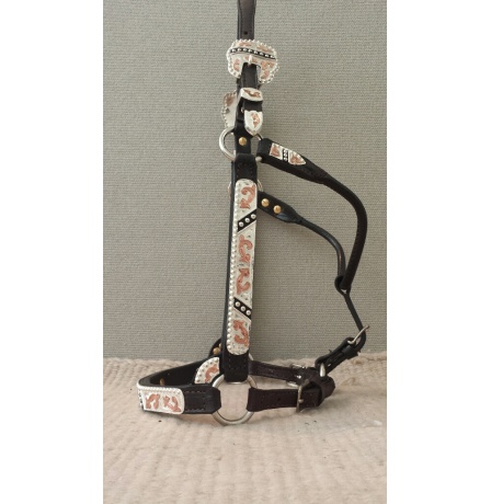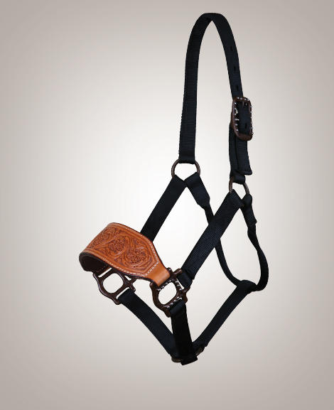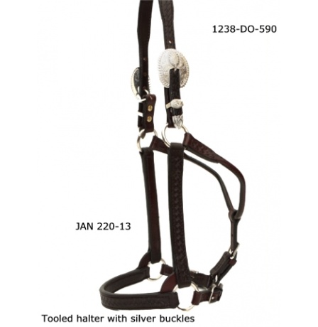 Tooled Halter With 590 Silver Buckles in dark oil leather. Available in Full, Mare, 2 Year Old and Yearling sizes.