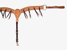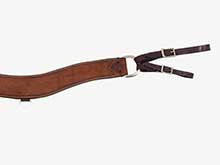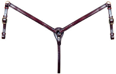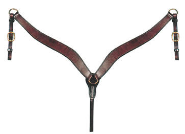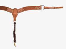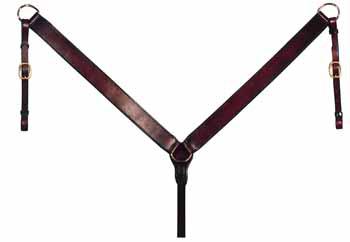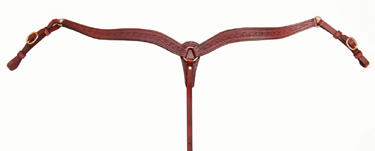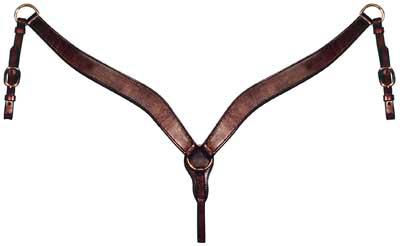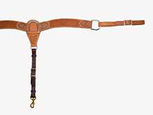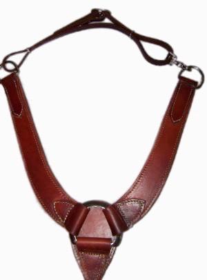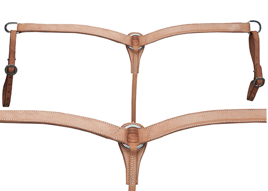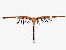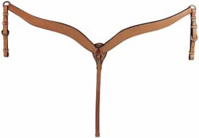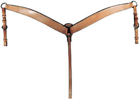 Big Horn Breast Collar Contoured Center Ring Breast Collar Shaped skirting leather breast collar, tapered from 2 1/4" to 1 1/4". 3/4" end straps and 3/4" tie down. Medium oil color. No. A02366 Made in the USA