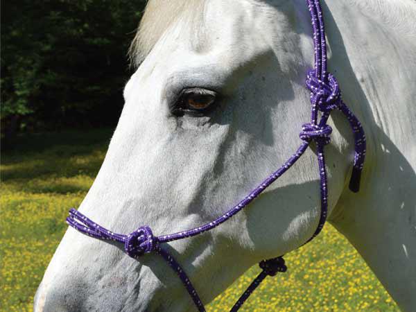 Customize fit by adjusting crown piece and noseband 2 training knots on noseband placed in specific locations to apply pressure in certain areas of the horses nose Promotes better control while teaching horses to yield to pressure No hardware Fully washable Will not rot Equi-Sky Glitter Rope Halter Braided soft polypropylene rope knotted 5/16'' diameter