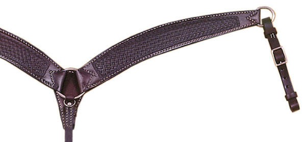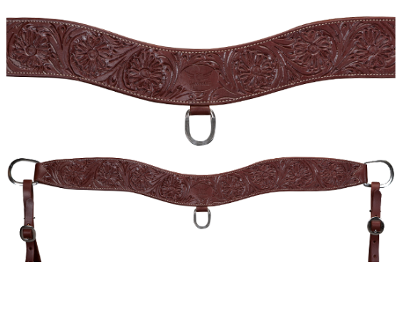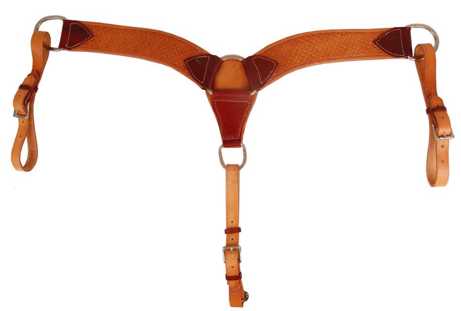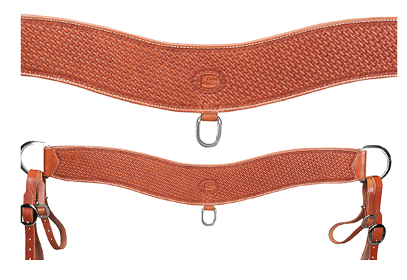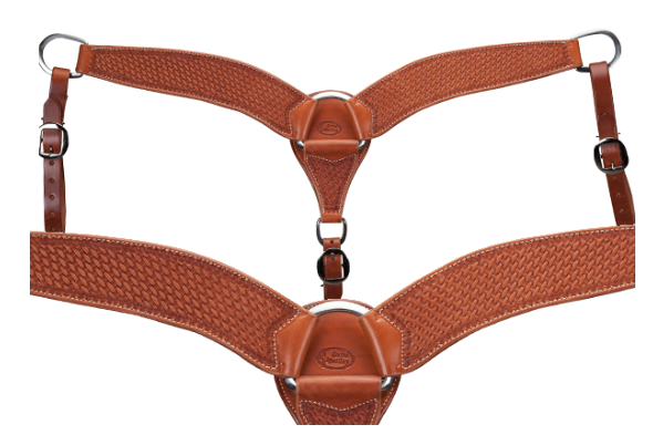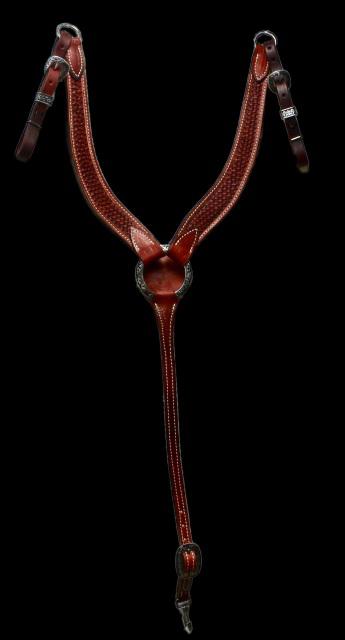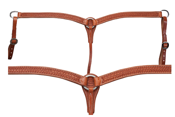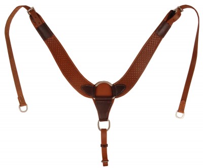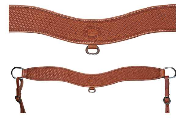 All-Around Roping Breast Collar R/C All around roping breast collar doubled and stitched bridle leather. 2 1/3" shaped two-piece body with basket weave tooling. Available in Rich Chestnut #3207 or Medium Oil #3208