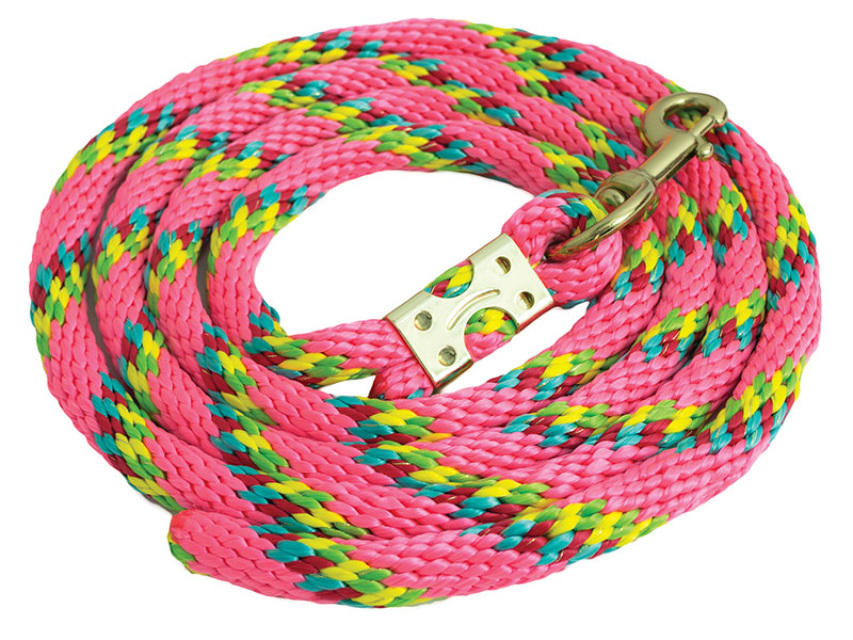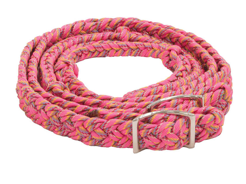 Adjustable to fit horse Customize fit by adjusting crown piece and noseband 2 training knots on noseband placed in specific locations to apply pressure in certain areas of the horses nose Promotes better control while teaching horses to yield to pressure No hardware Fully washable Will not rot Equi-Sky Training Rope Halter Nylon rope knotted 5/16'' diameter confetti combination of hot pink, purple,
