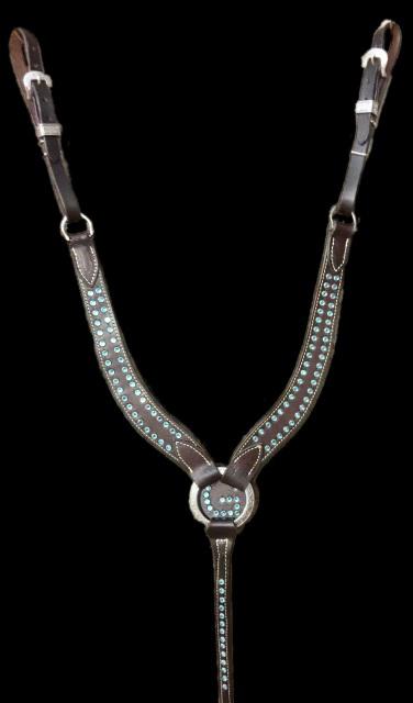 Custom Bling double ply breast collar shown in chocolate with Jeremiah Watts hardware and swarovski crystal borders and initial made with crystals. Call 608-583-2272 or 608-475-0573 to order website will not allow all options (Leather and Crystal colors and Letter for initial)