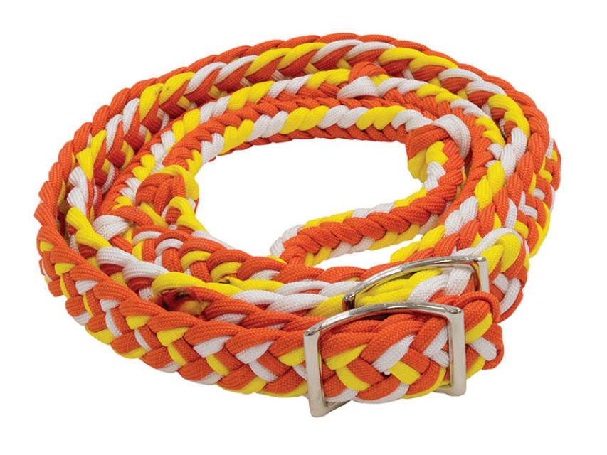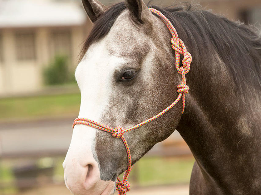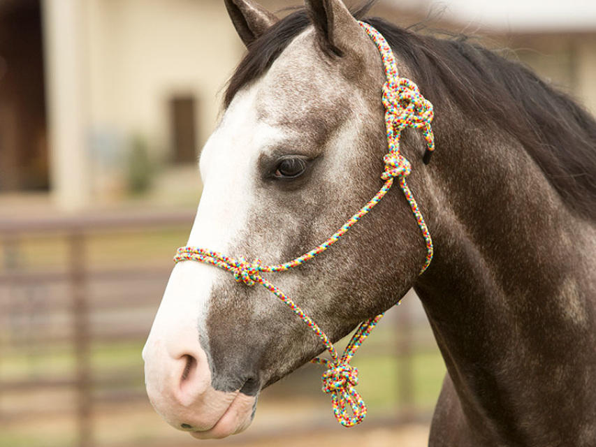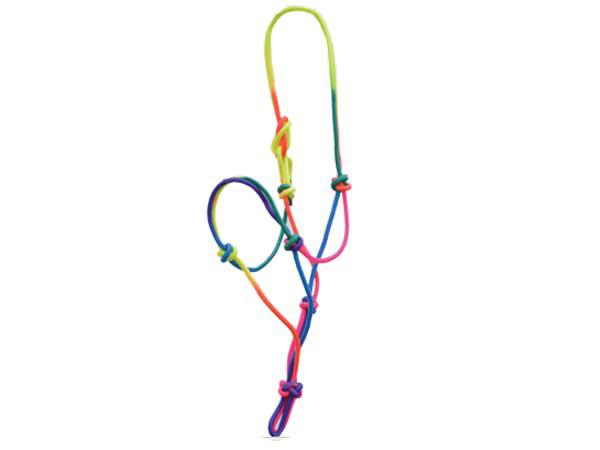 Adjustable to fit horse Customize fit by adjusting crown piece and noseband 4 training knots on noseband placed in specific locations to apply pressure in certain areas of the horses nose Promotes better control while teaching horses to yield to pressure No hardware Fully washable Will not rot Equi-Sky Rainbow Rope Halter Nylon rope knotted 5/16'' diameter
