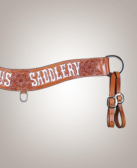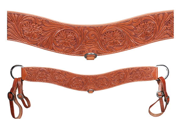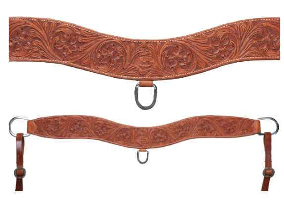 Trevor Brazile designed the cut and size of this 4-inch wide All-Around tripping collar. Hermann Oak Trevor Flower Tooled Smooth or Roughout Oiled to match saddle Stainless Hardware