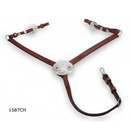 Tooled Concho Breast Collar Available in light oil, dark oil, chestnut, chocolate, and black. Please allow 4-6 weeks