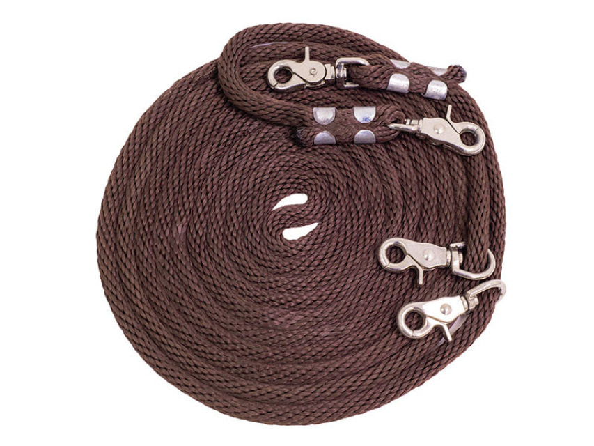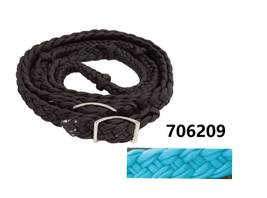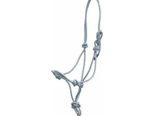 Adjustable to fit horse Customize fit by adjusting crown piece and noseband 2 training knots on noseband placed in specific locations to apply pressure in certain areas of the horses nose Promotes better control while teaching horses to yield to pressure No hardware Fully washable Will not rot Equi-Sky Metallic Rope Halter Braided soft polypropylene rope knotted 5/16'' diameter