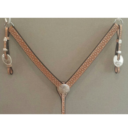 Tooled concho breast collar with dots shown in light oil. Also available in dark oil, chestnut and mahogany leather and your choice of concho and buckle silver pattern. Please allow 4-6 weeks