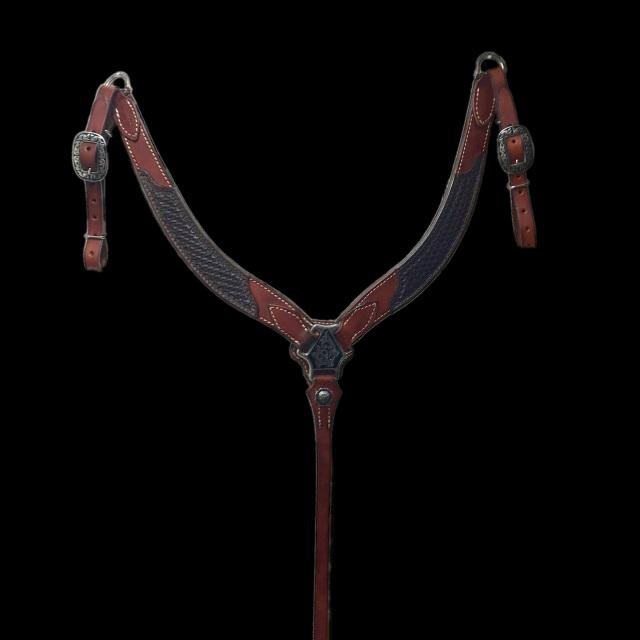 Custom two tone breast collar shown in mahogany with chocolate accents with basket weave tooling and Jeremiah Watts hardware.